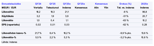 Bittiumin aamulla julkaisema Q3-tulos ylitti isolla marginaalilla odotuksemme. Perinteisesti tuotetoimituksien osalta hiljaisella jaksolla Defense & Security -tuotteet liikkuivat hyvin, mitä kautta segmentin liikevaihto nousi yli 120 %. Tuotevolyymien voimakkaan kasvun mukana myös Defense & Securityn kannattavuus parani merkittävästi ja ylitti odotuksemme. Medical- ja Engineering -segmentit ylsivät tulosodotuksiimme, vaikka kehitys jätti toivomisen varaa. Negatiivisella puolella Defense & Security -segmentin tilauskertymä oli Q3:lla vaisu ja konsernin rahavirrat olivat Q3:lla heikkoja. Vuoden 2025 ohjeistus oli odotetusti ennallaan ja paineet Q4:lle pienenivät merkittävästi. Isossa kuvassa emme havainneet oleellisia muutoksia, mutta Q3 oli mielestämme vahva osoitus Bittiumin parantuneesta toimituskyvystä.