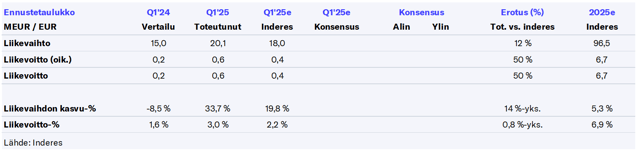 Viafin Servicen ensimmäisen kvartaalin tulos ylitti analyytikon ennakkoodotukset osittain, erityisesti liikevaihto kasvoi ennakoitua voimakkaammin. Liikevoitto parani, mutta ei aivan yhtä paljon kuin analyytikko oli odottanut. Yhtiön antama ohjeistus pysyi muuttumattomana, mikä heijastaa jonkinasteista varovaisuutta tulevaisuuden näkymissä huolimatta myönteisestä alkuvuodesta.